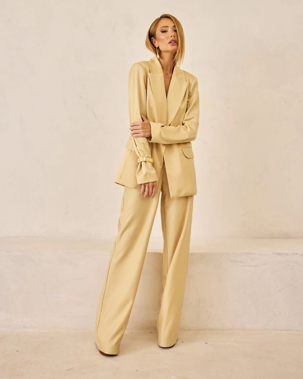 Blazer confeccionado em crepe alfaiataria com textura acetinada, ombros marcados com ombreiras e bolsos frontais. Fechamento com botão encapado.