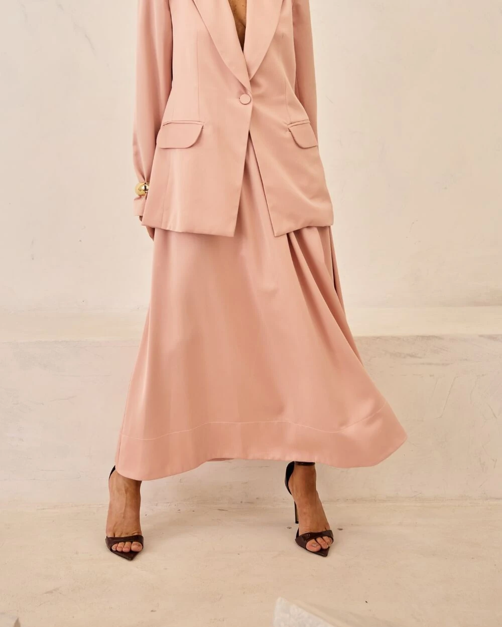 Saia midi confeccionada em crepe alfaiataria com textura acetinada, volume evasê e fechamento lateral com zíper invisível.