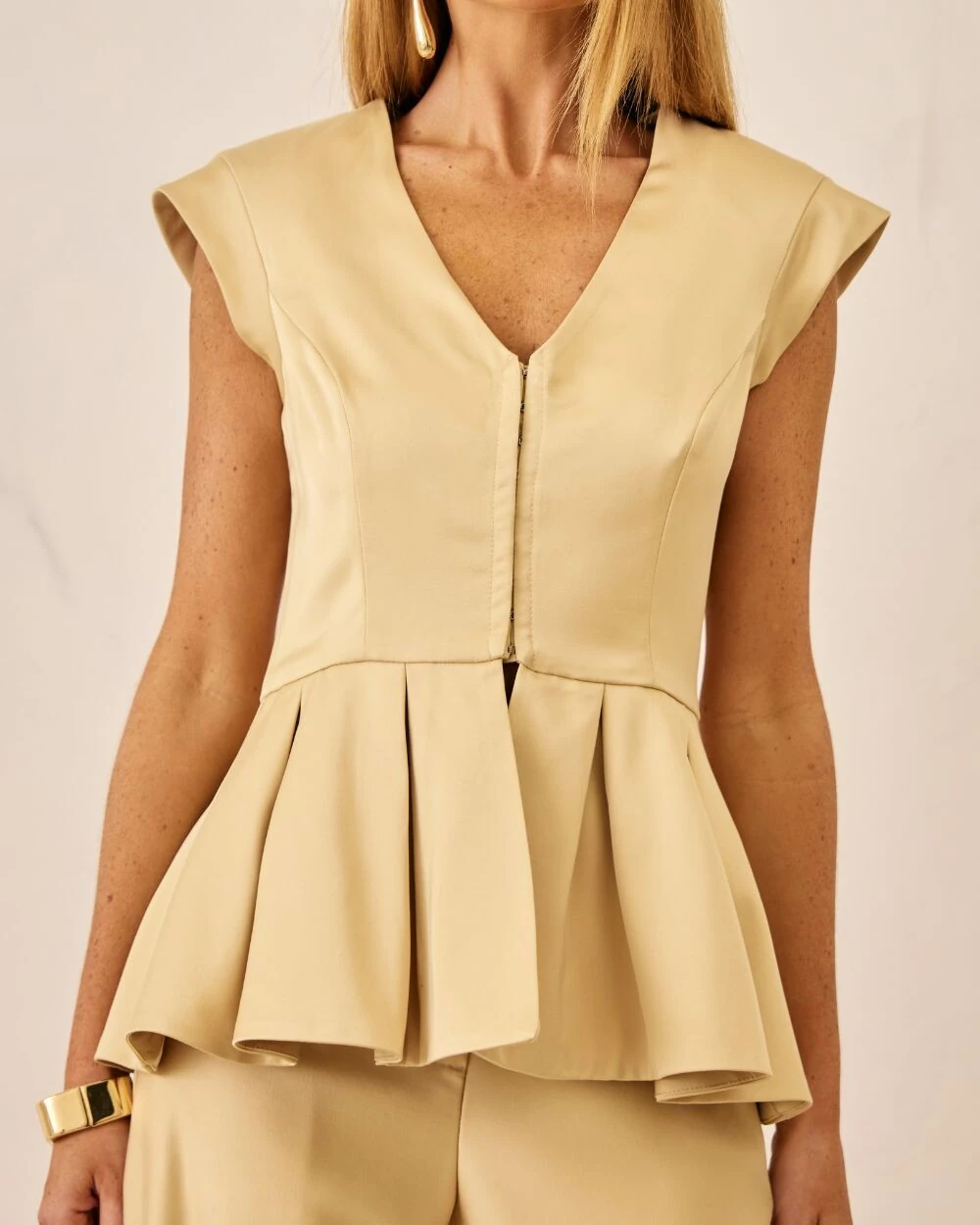 Blusa confeccionada em crepe alfaiataria com babados na barra, ombros alongados, decote em V e fechamento frontal com colchetes.