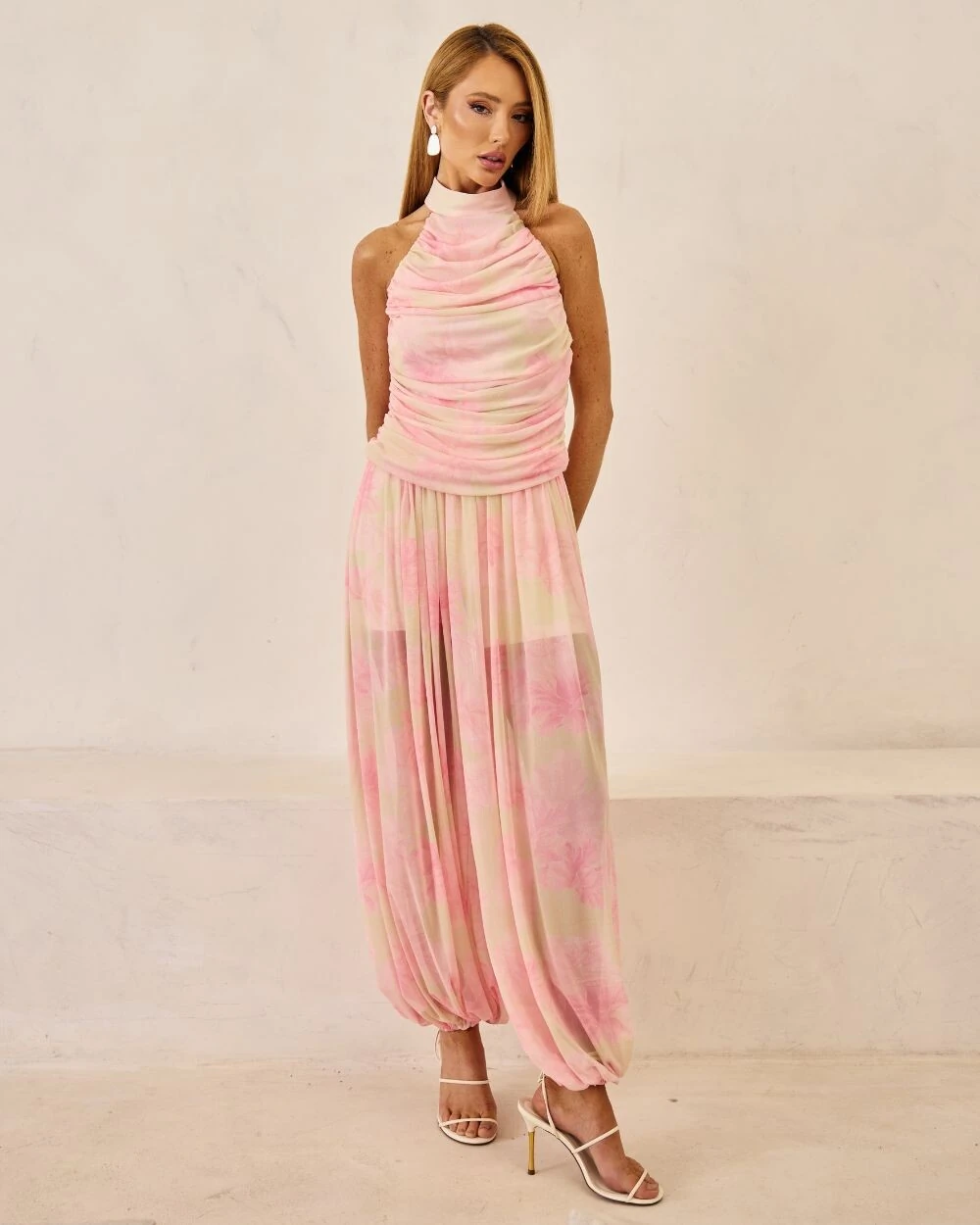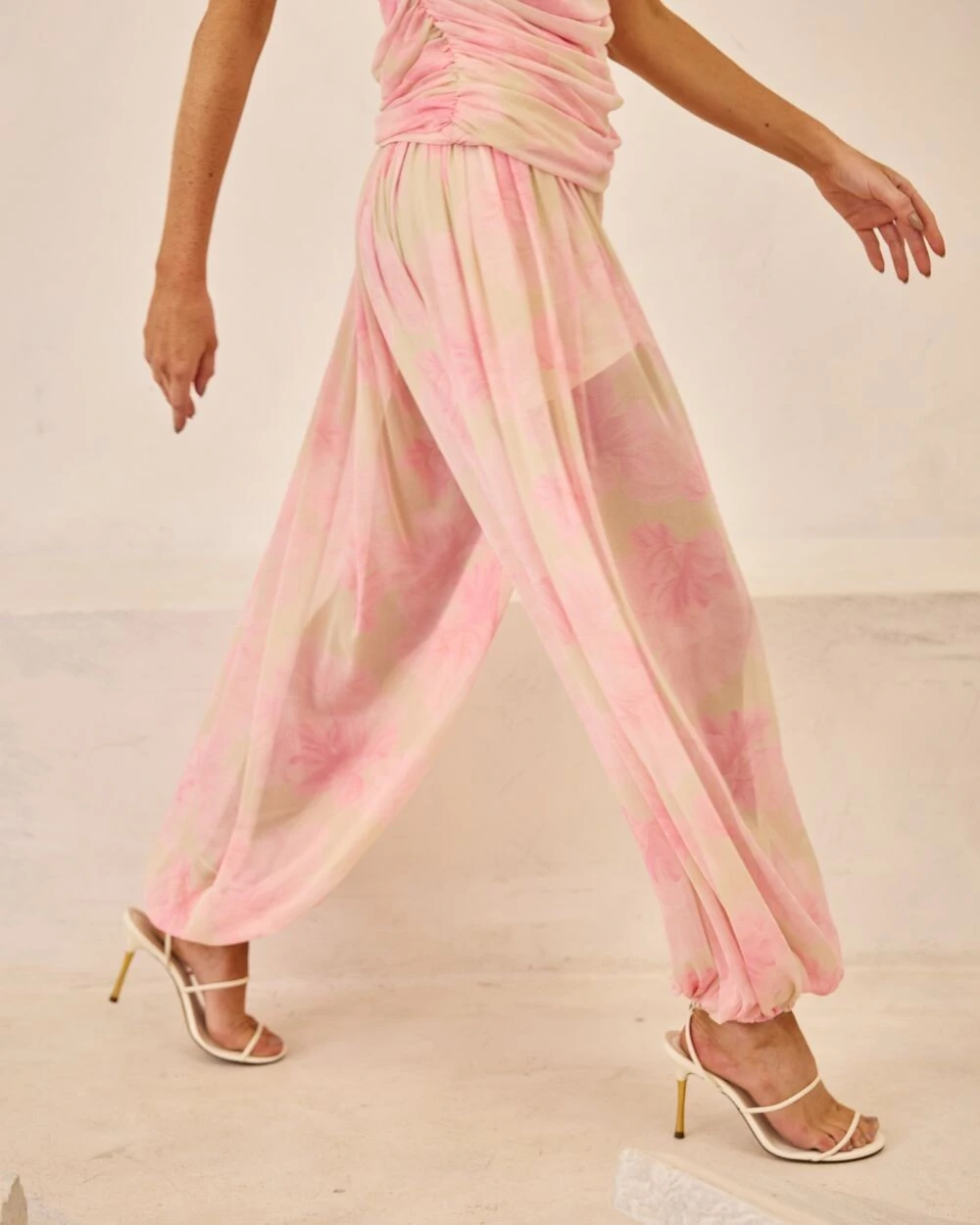 Calça confeccionada em tule com modelagem balão e estampa floral exclusiva. Acompanha forro de shorts.