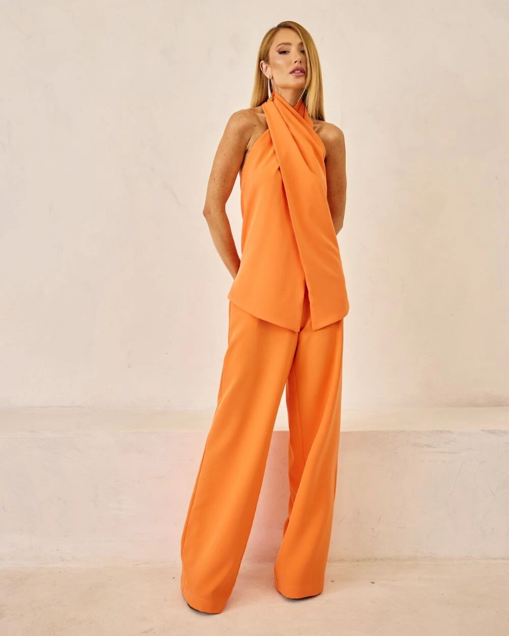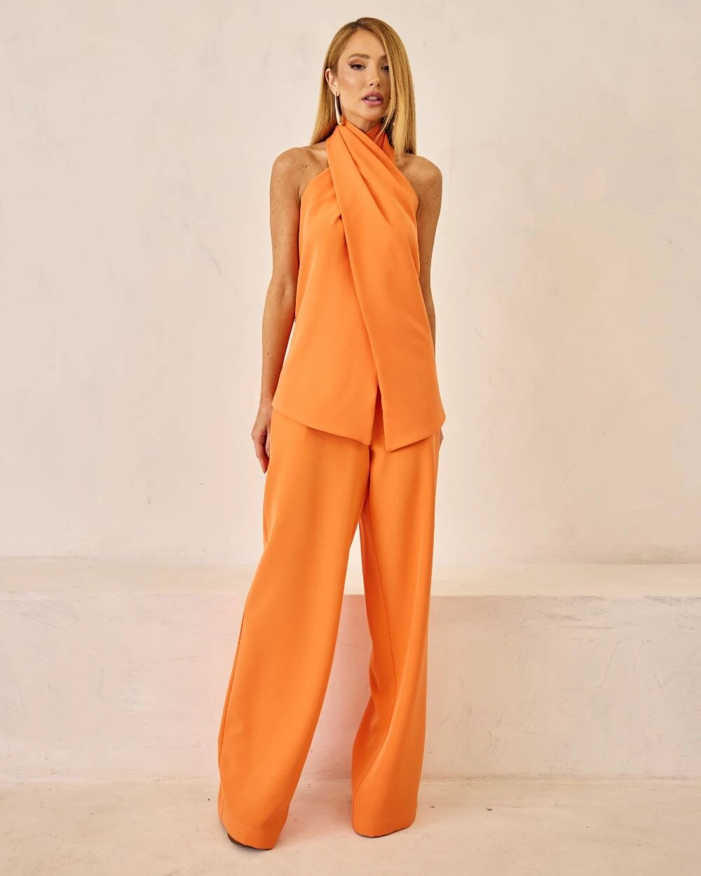 Calça confeccionada em crepe alfaiataria, bolsos laterais e traseiros. Fechamento frontal com zíper comum e botão encapado.