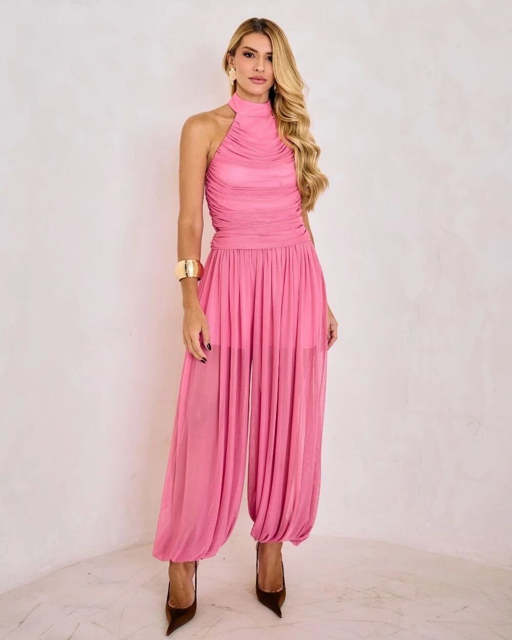 Blusa frente única confeccionada em tule com drapeados no busto e fechamento na gola com botões.