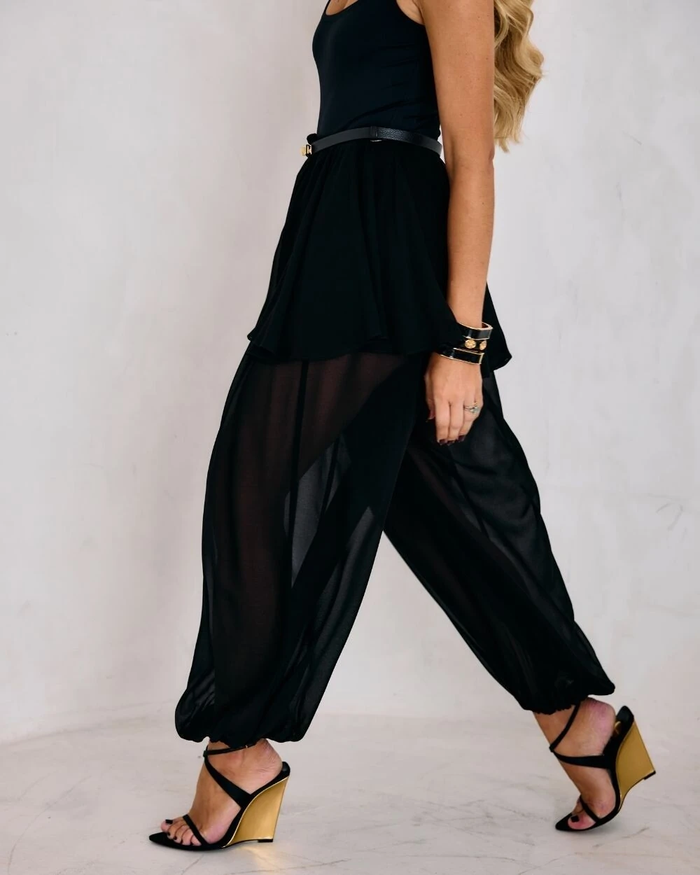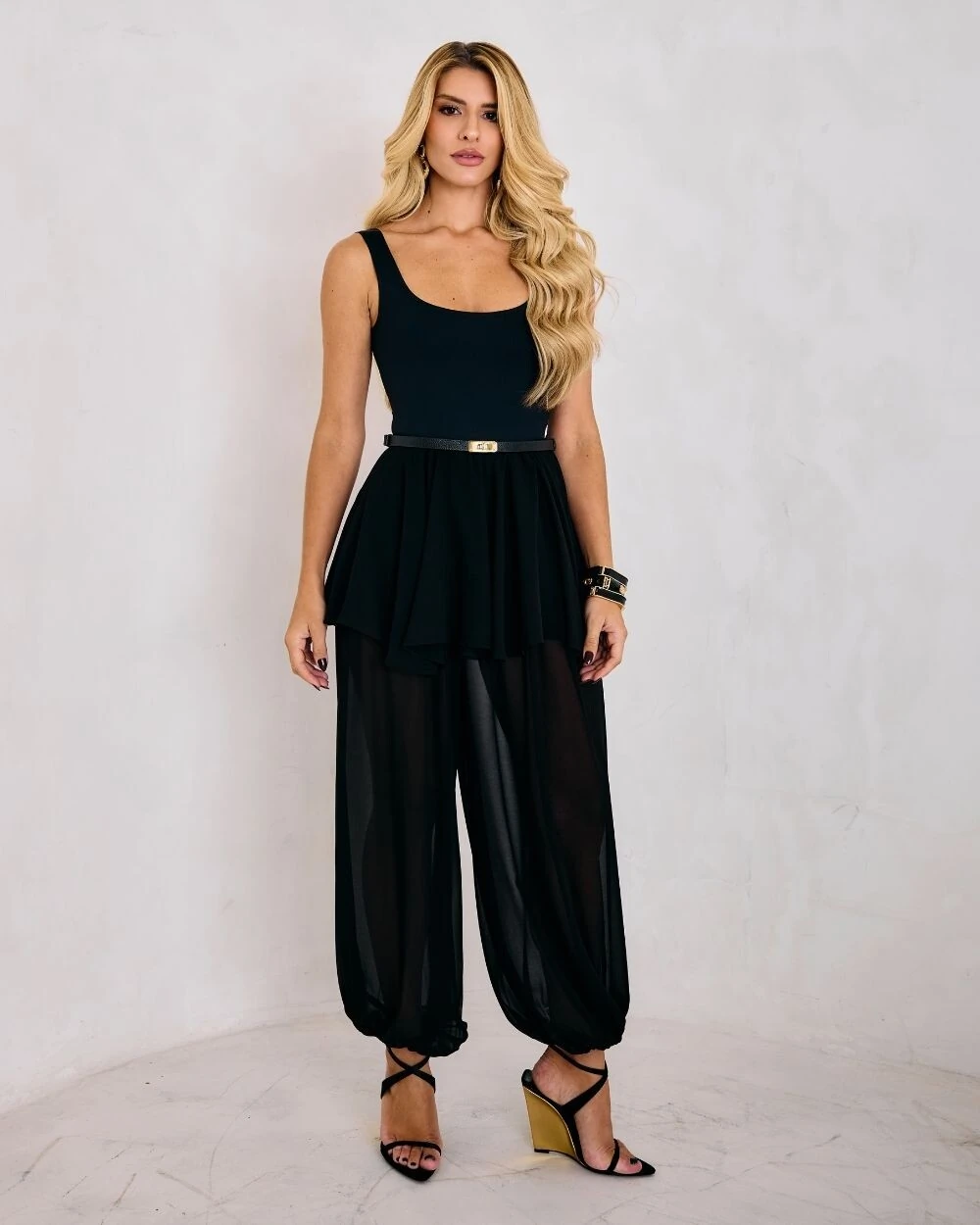 Calça confeccionada em chiffon com modelagem ballon e peplum fixo. Fechamento lateral com zíper invisível.