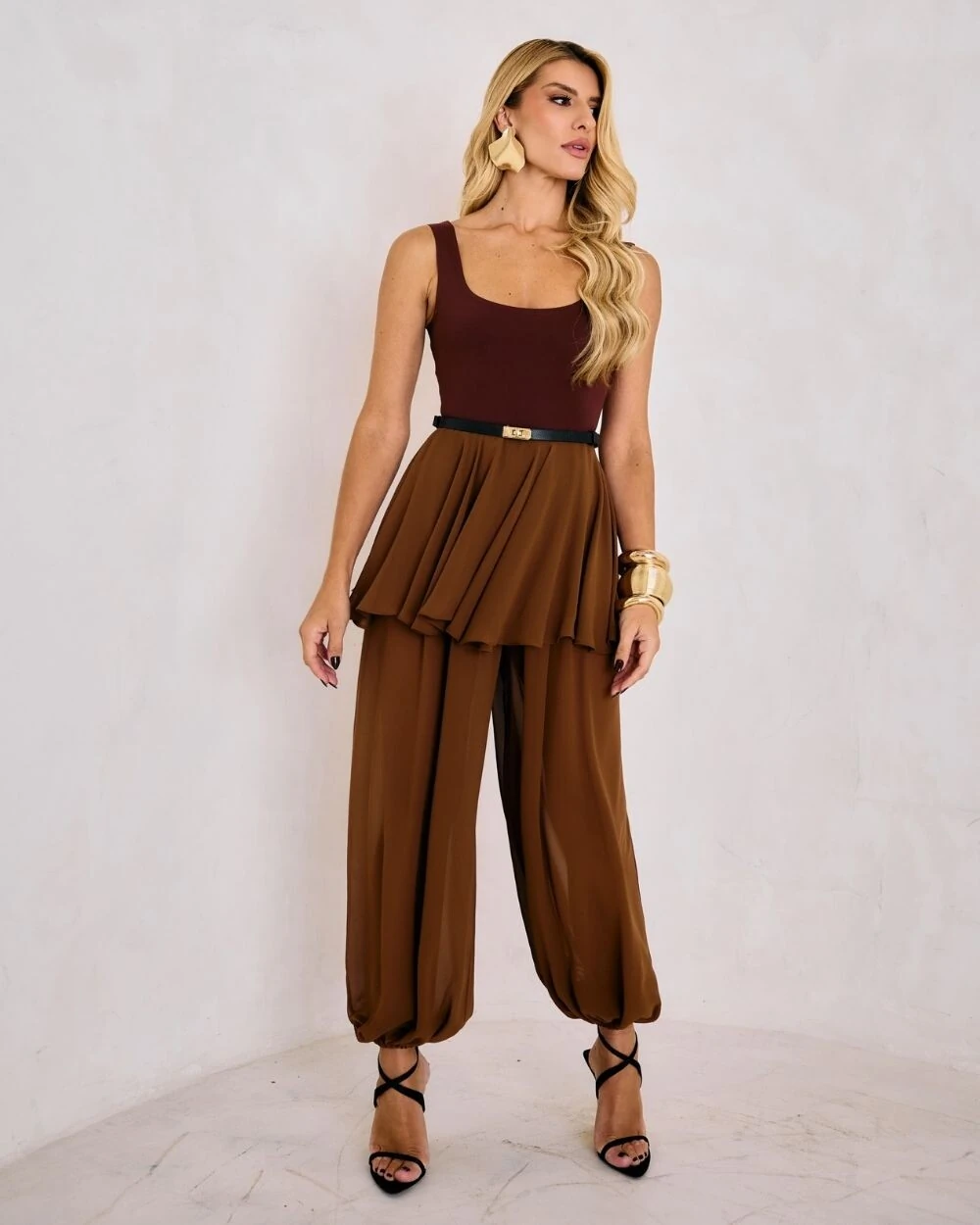 Calça confeccionada em chiffon com modelagem ballon e peplum fixo. Fechamento lateral com zíper invisível.