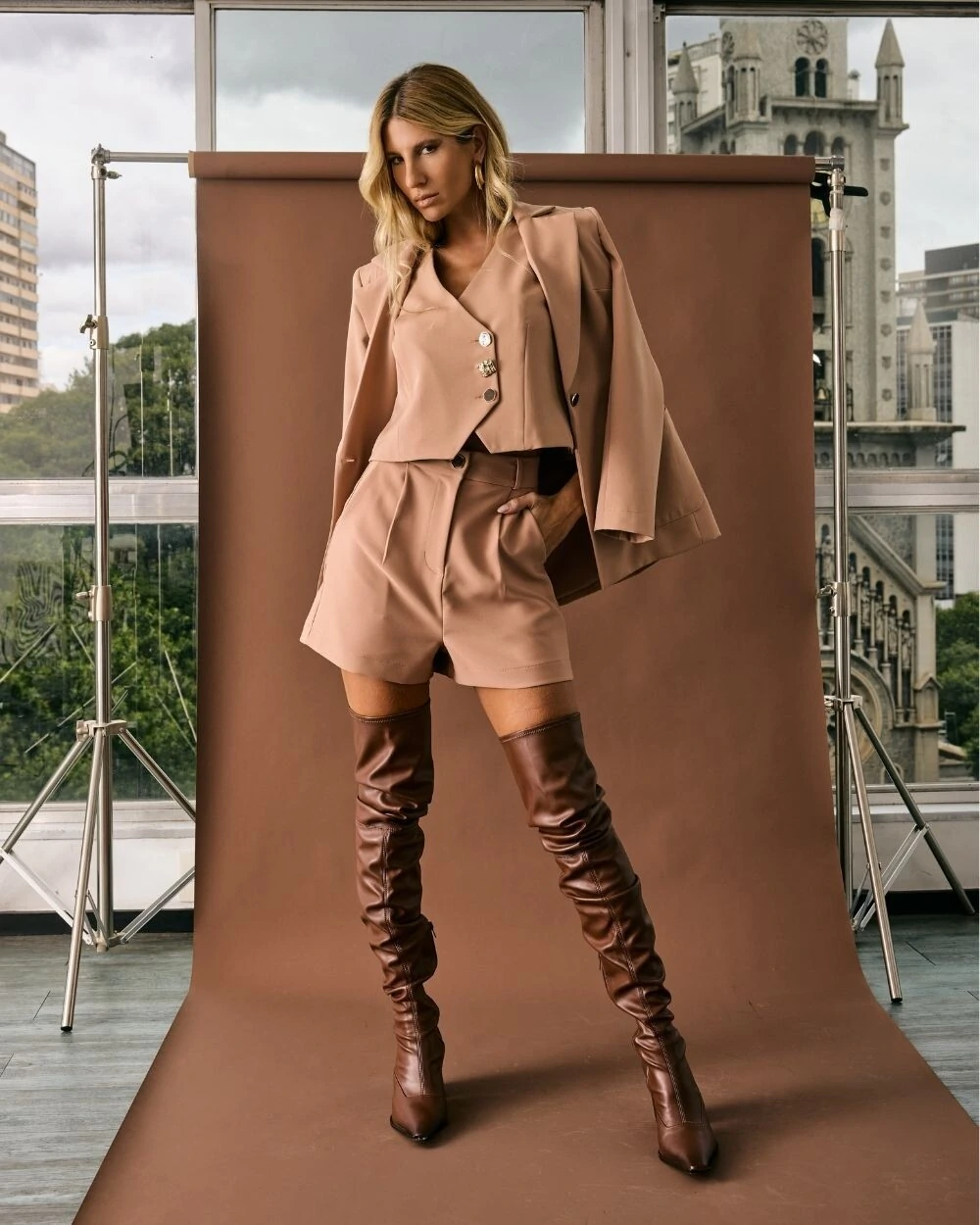 Colete confeccionado em crepe alfaiataria com fechamento com mix de botões.