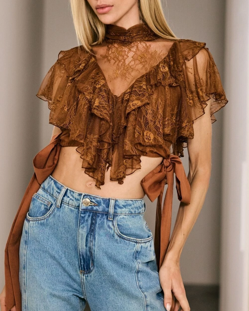 Blusa confeccionada em renda delicada com transparência, modelagem curta e caimento leve. Possui gola alta e babados aplicados na parte frontal que trazem textura e movimento à peça. Apresenta mangas curtas em renda e faixas laterais para amarração, permitindo ajuste ao corpo. Uma peça sofisticada que valoriza produções femininas e contemporâneas.