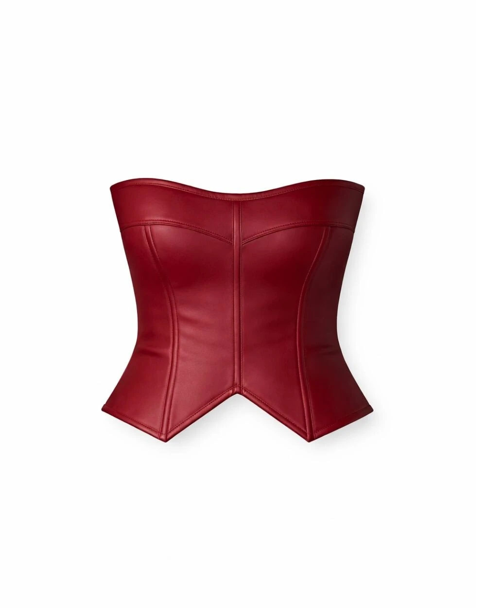 Corset confeccionado em couro PU com decote e barra assimétricos e recortes frontais para dar estrutura. Fechamento nas costas com zíper de metal. Acompanha faixa.