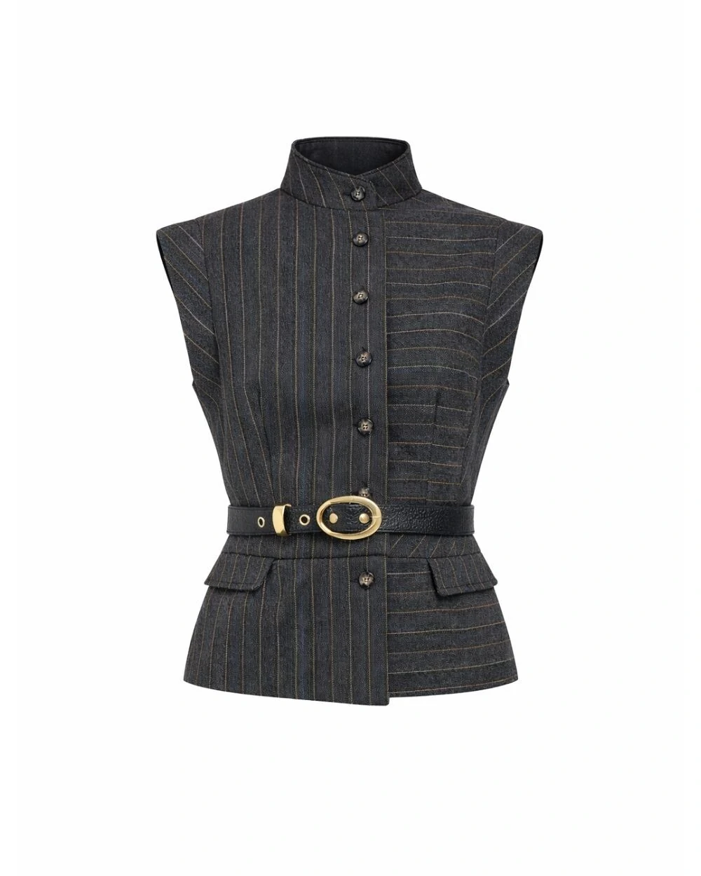 Colete em alfaiataria risca de giz com estrutura encorpada.