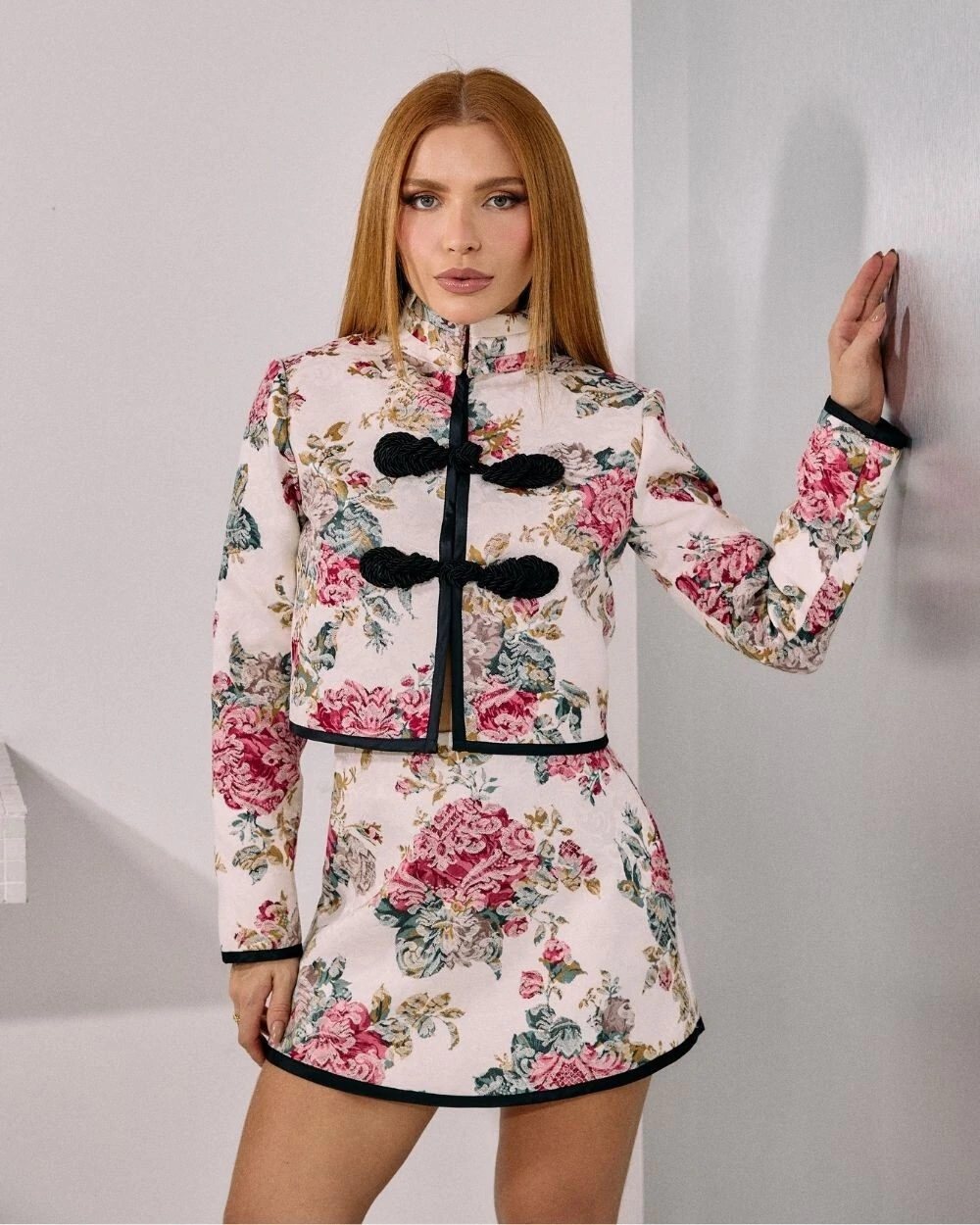Shorts saia em jacquard com padronagem floral e estrutura encorpada.