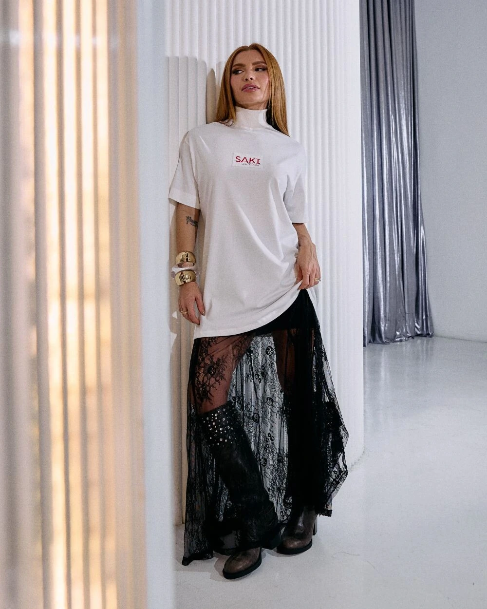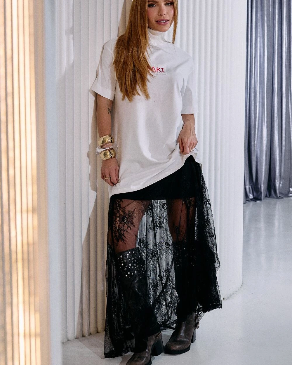 Possui fechamento por zíper invisível lateral e acabamento delicado na barra.
