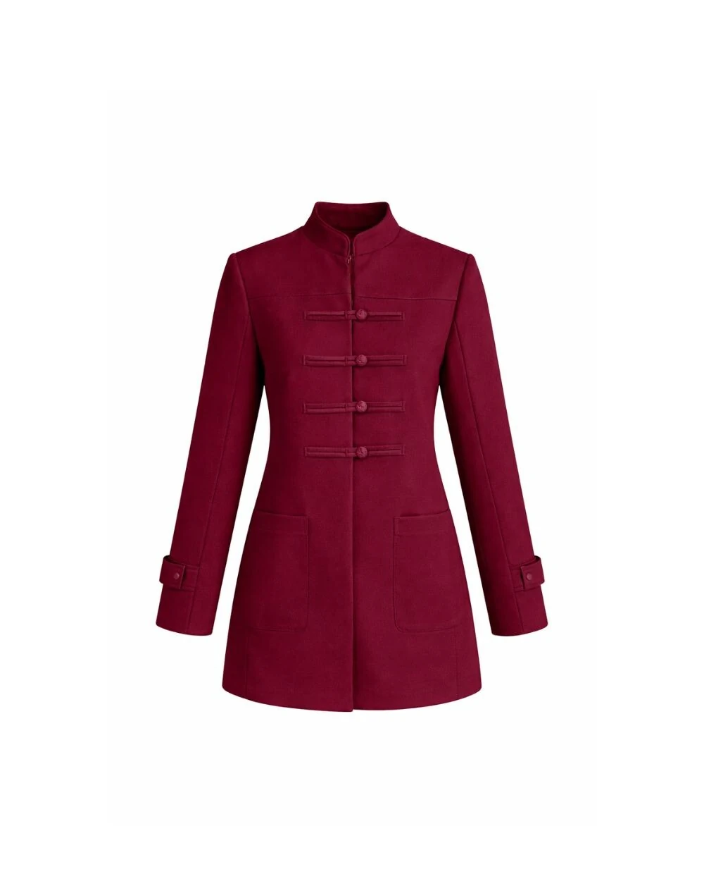 Possui fechamento frontal com botões estilo oriental e bolsos aplicados.