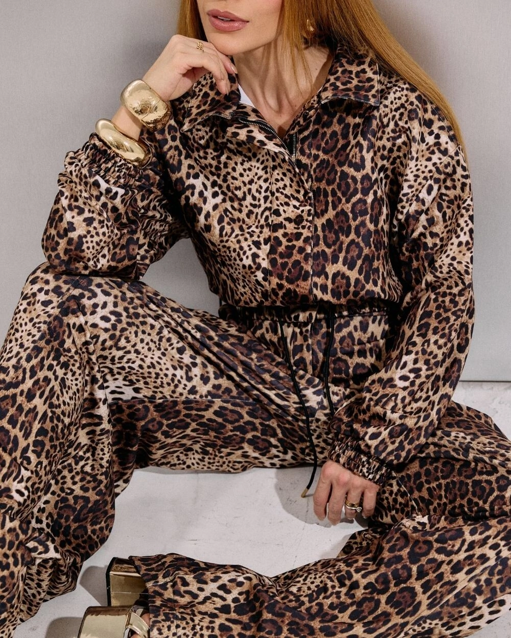 Calça confeccionada em moletom com estampa de onça, criando um visual marcante.