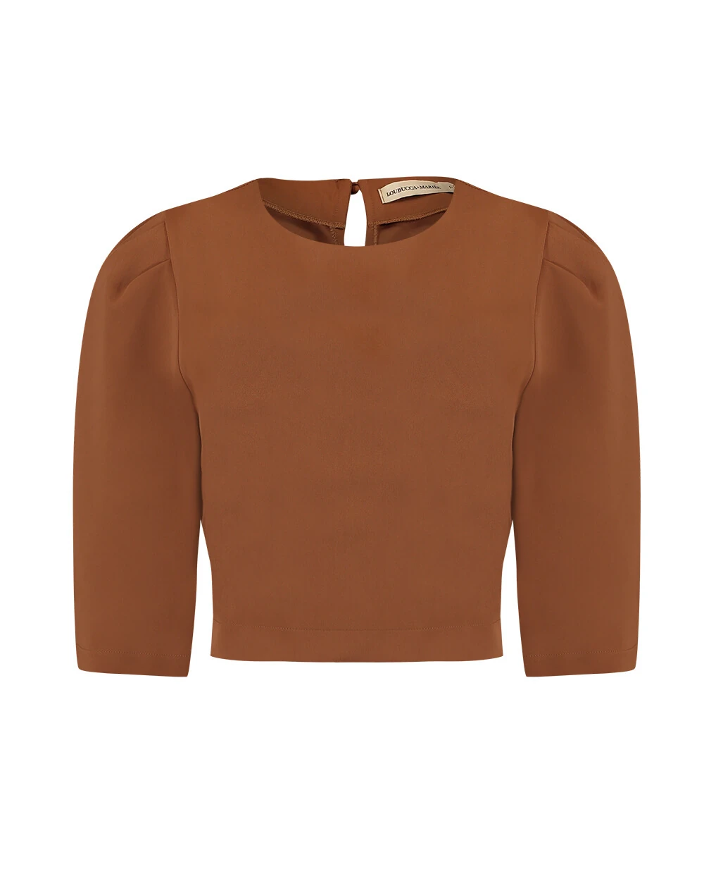 Cropped em crepe alfaiataria Dorf com mangas ¾ e ombros estruturados.