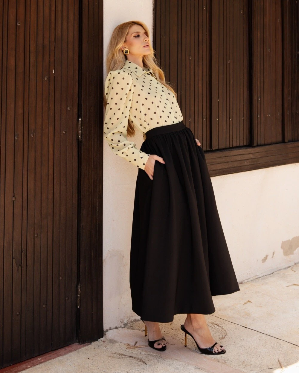 Saia midi confeccionada em Technoblend, fechamento com zíper invisível na parte posterior.