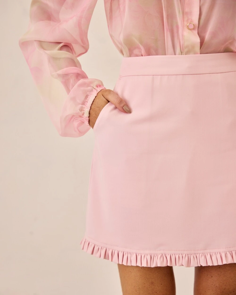 Saia curta confeccionada em crepe alfaiataria com bolsos laterais, babado na barra e fechamento lateral com zíper invisível.