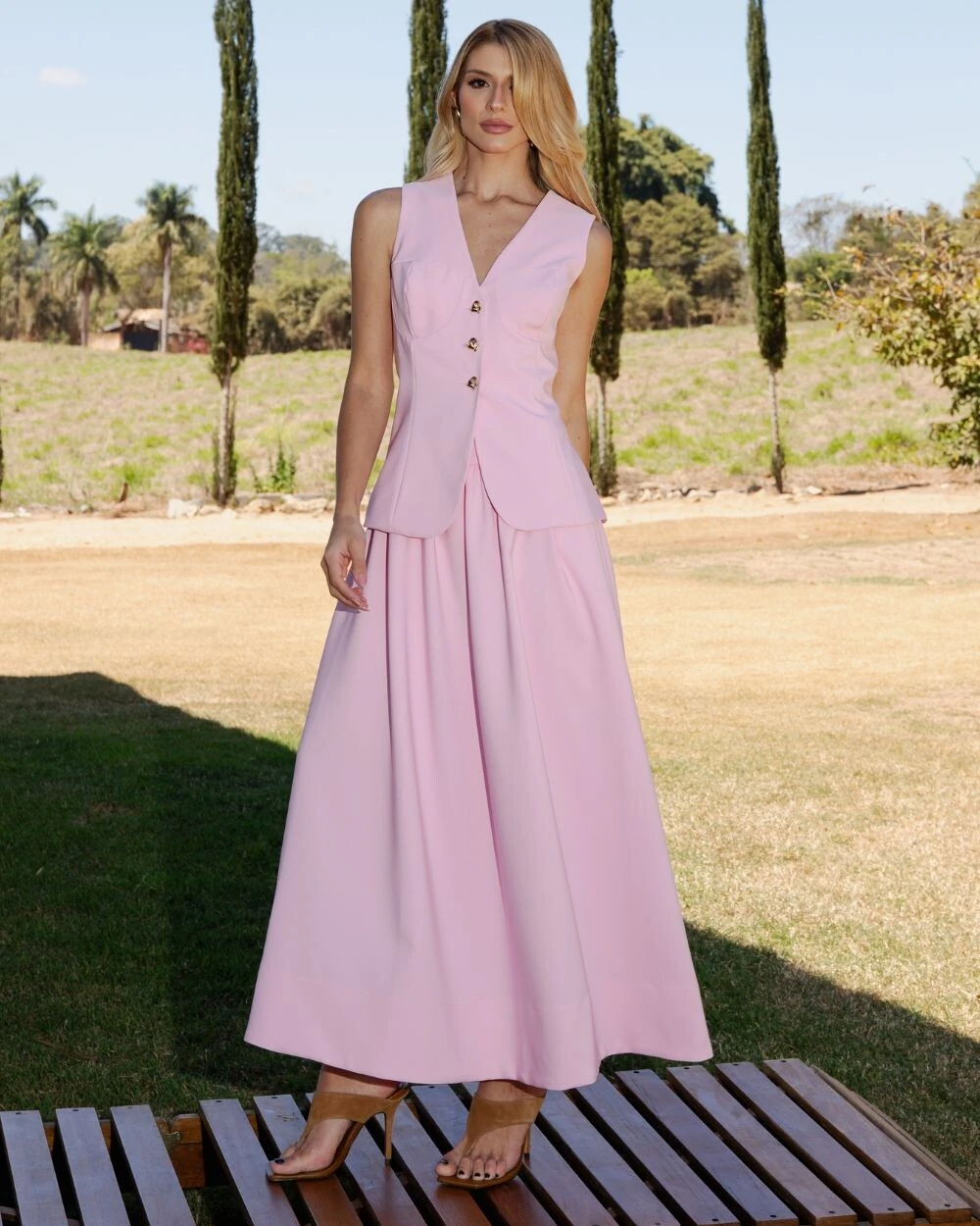 Blusa confeccionada em crepe alfaiataria com decote em V, busto estruturado, barra arredondada e fechamento frontal com botões dourados.