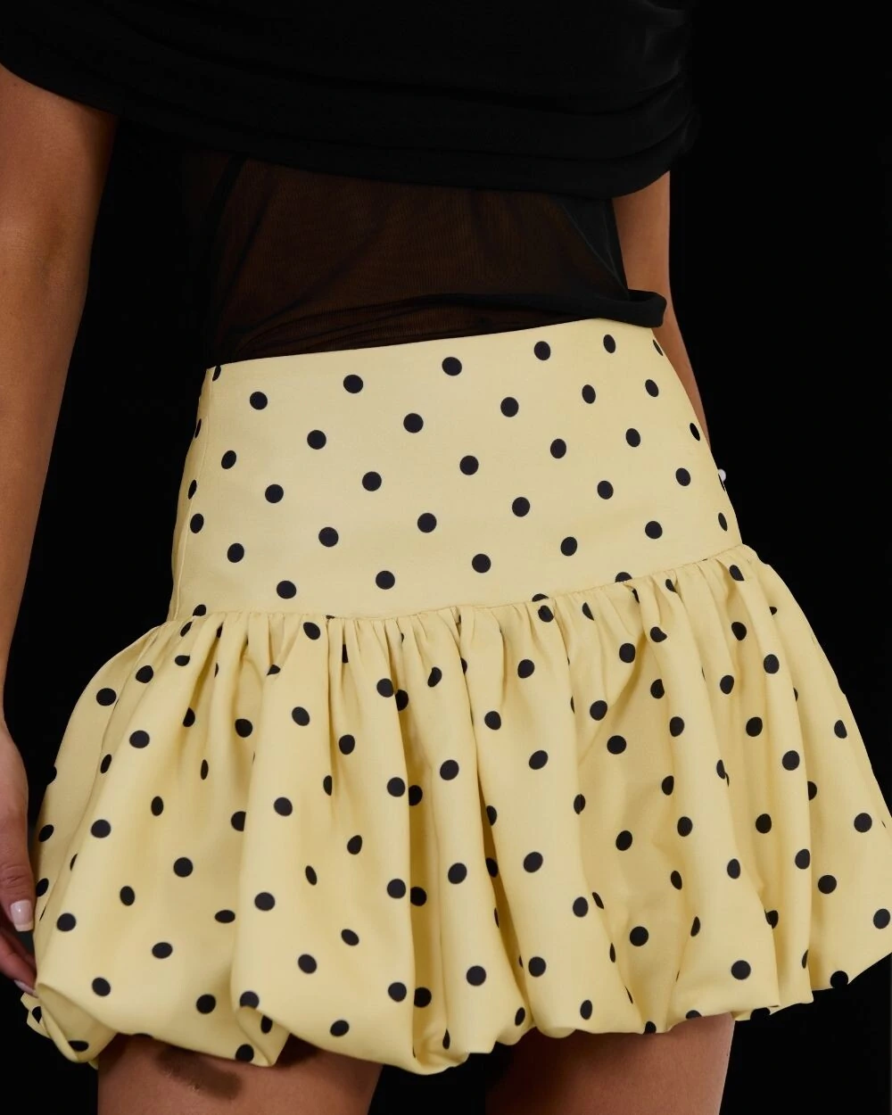 Saia curta com modelagem godê balonê, confeccionada em crepe alfaiataria. Cós liso e estruturado, volume balonê na barra. Fechamento nas costas com zíper invisível.