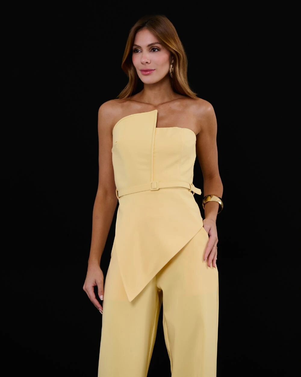 Tomara que caia confeccionado em crepe alfaiataria com detalhe de busto assimétrico estruturado; barra assimétrica e fechamento traseiro com zíper de metal.