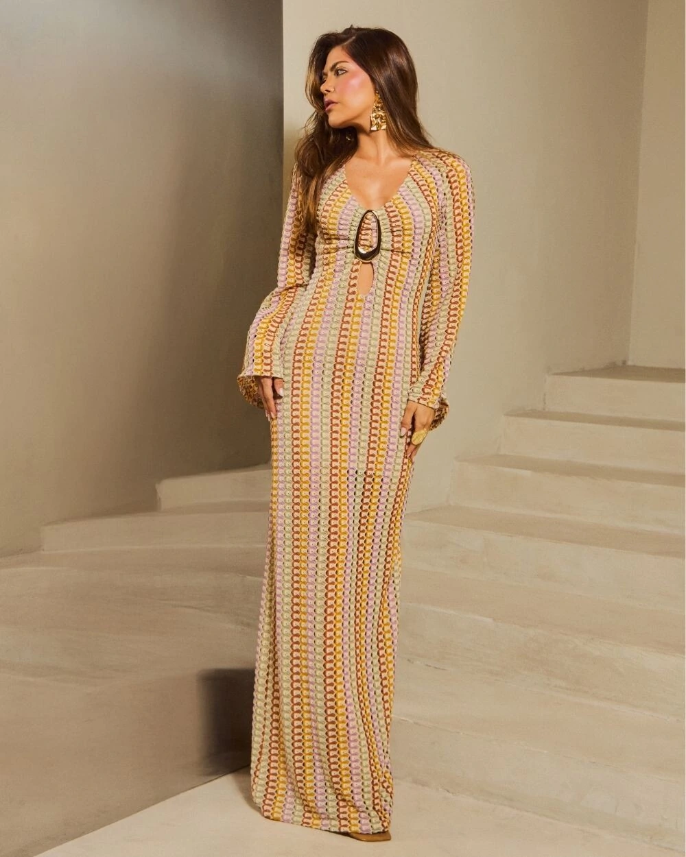 Vestido longo confeccionado em Missoni com mangas largas e detalhe central com fivela orgânica.