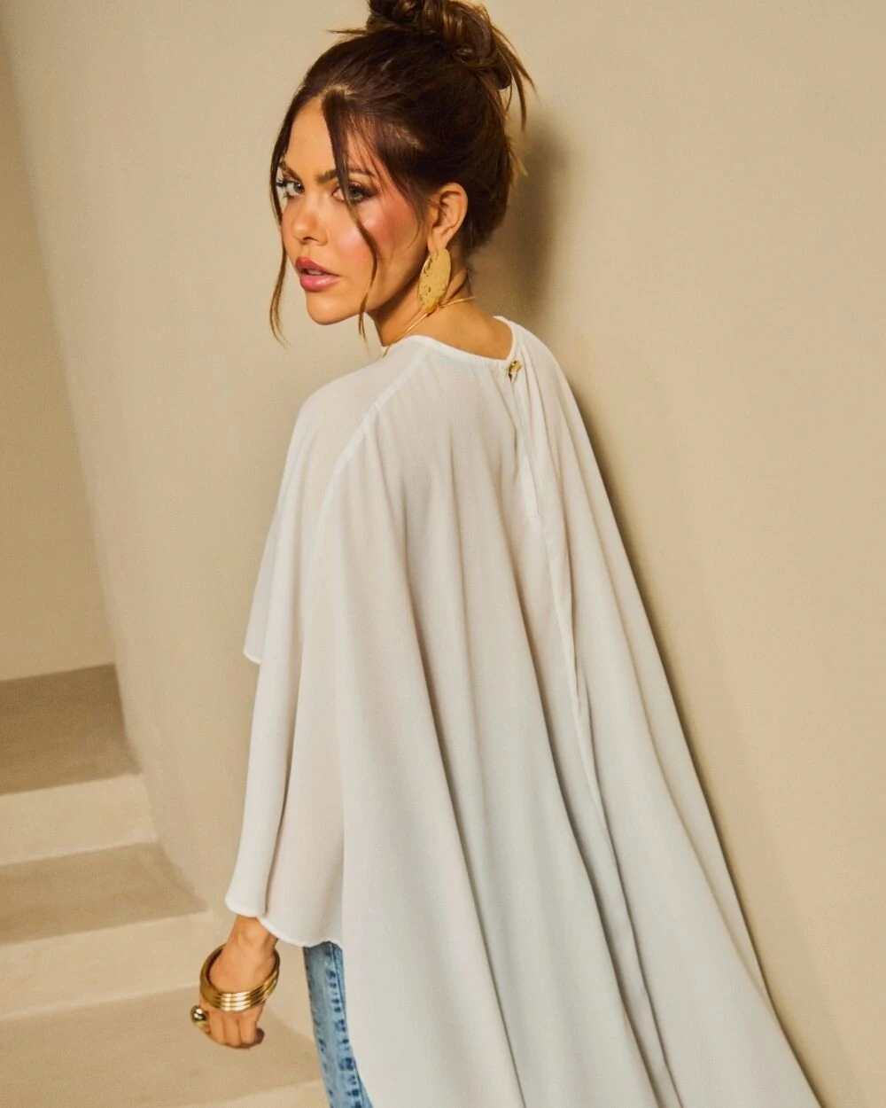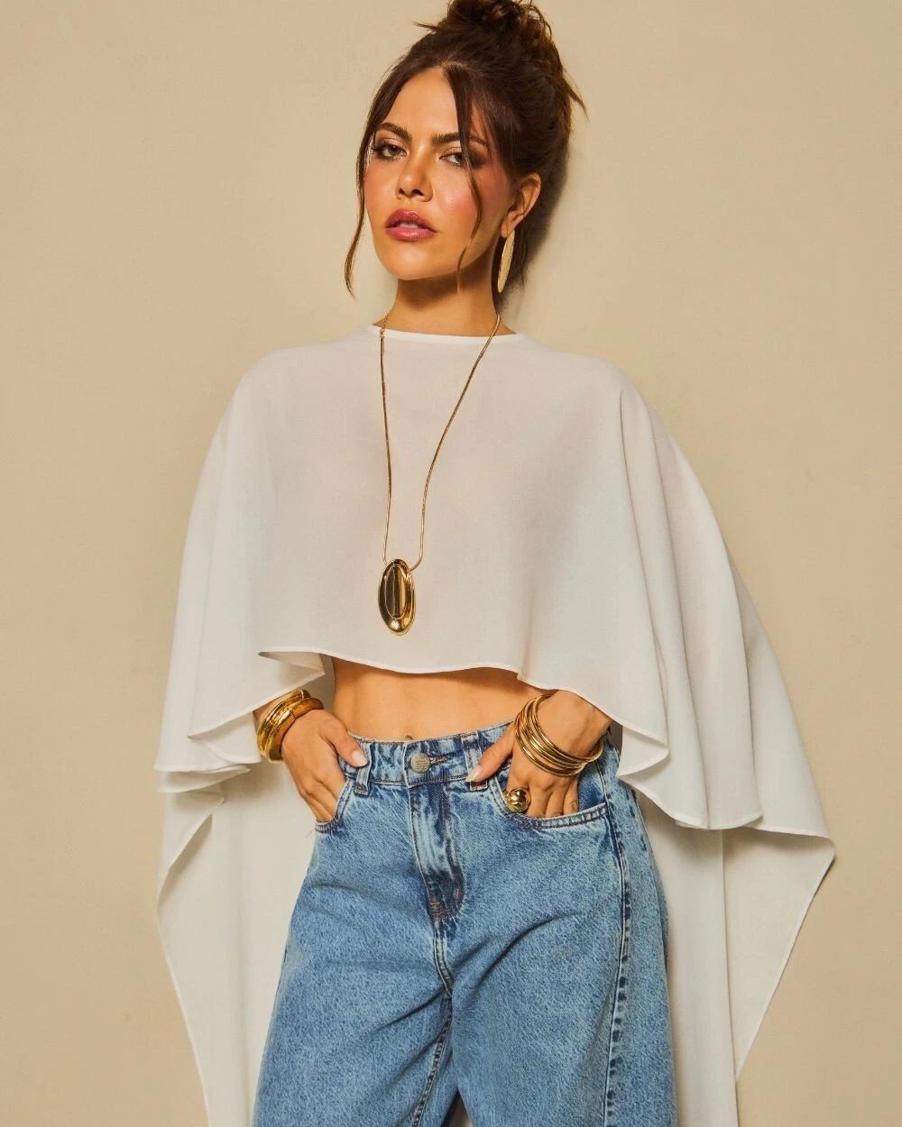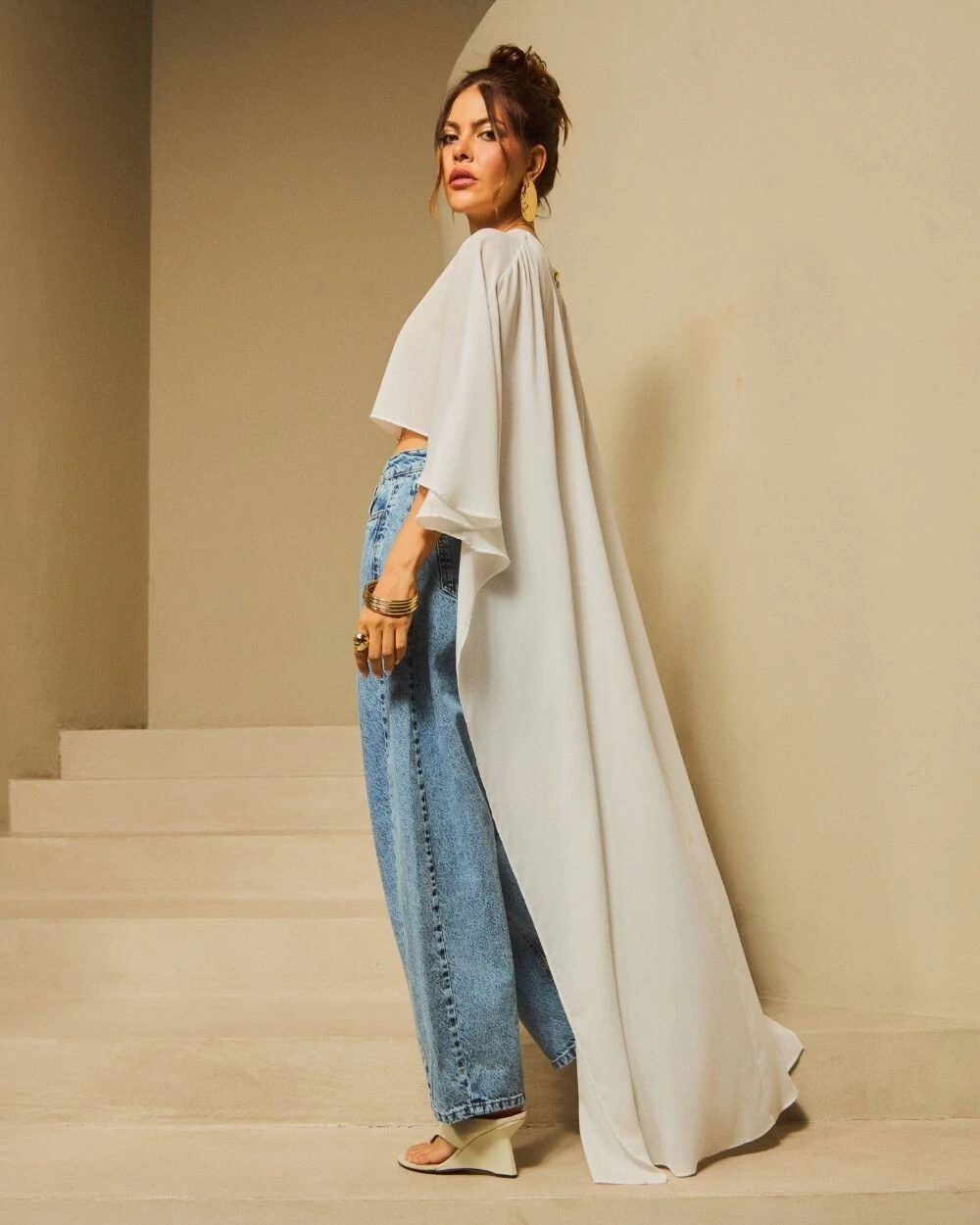 Bata confeccionada em crepe com silhueta solta, mangas amplas, comprimento cropped na frente com cauda longa nas costas. Fechamento na gola com botão dourado.