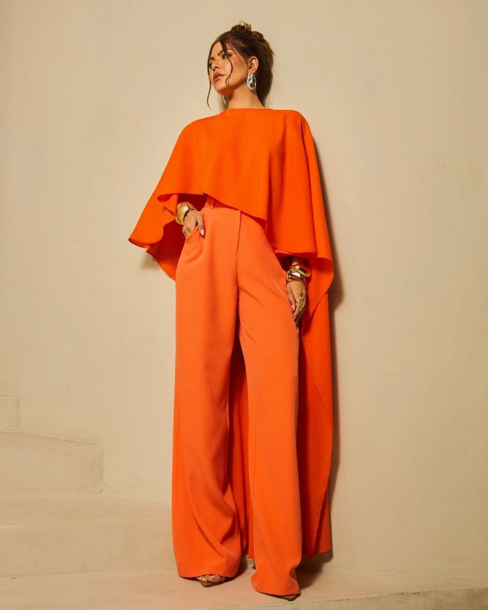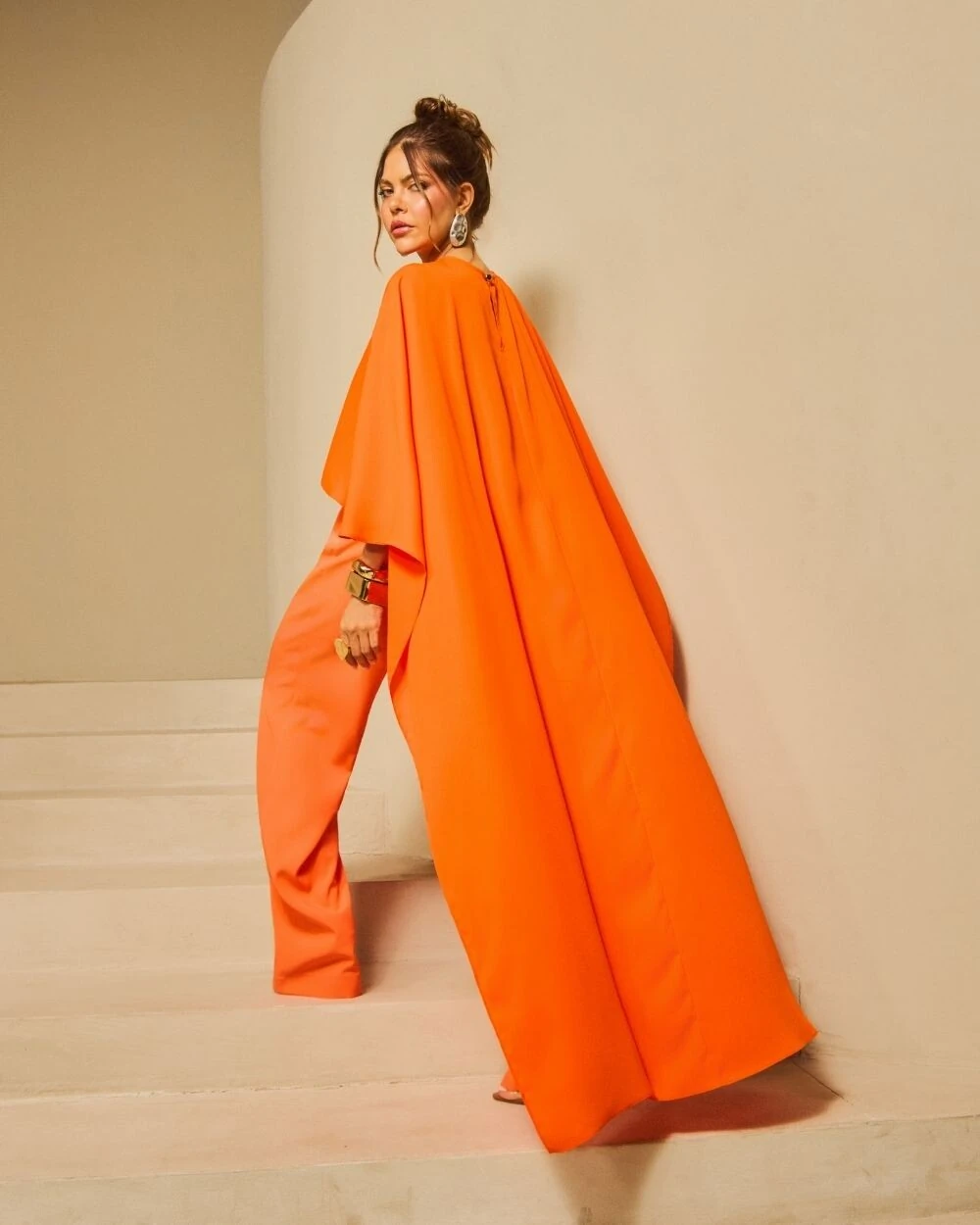 Bata confeccionada em crepe com silhueta solta, mangas amplas, comprimento cropped na frente com cauda longa nas costas. Fechamento na gola com botão dourado.